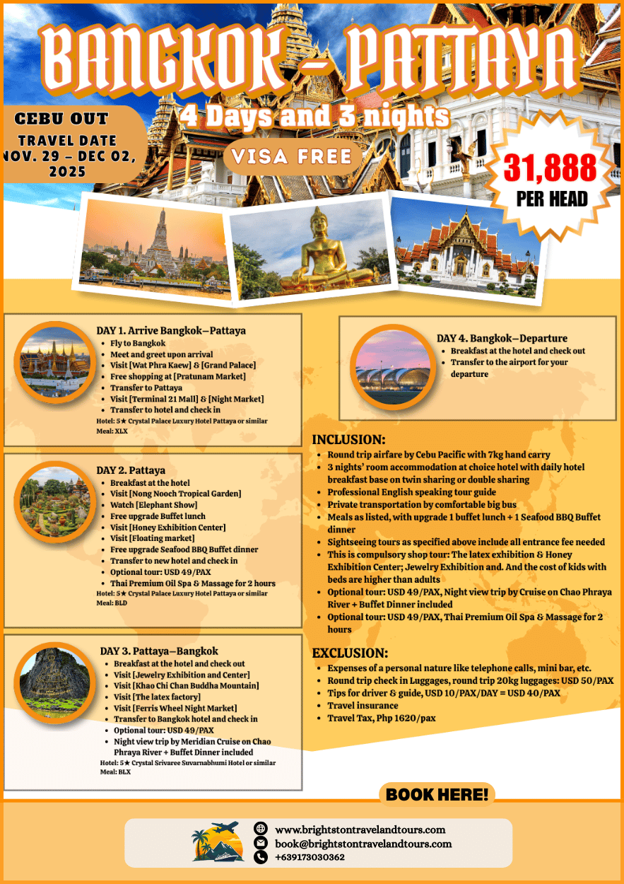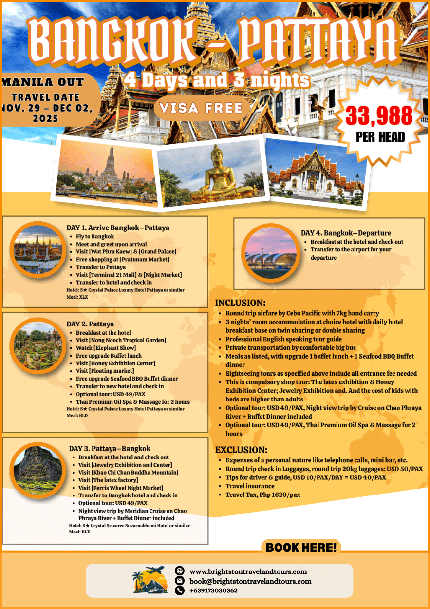 Ready to experience the magic of Thailand? From the golden temples of Bangkok to the vibrant beaches and nightlife of Pattaya, this package has it all!