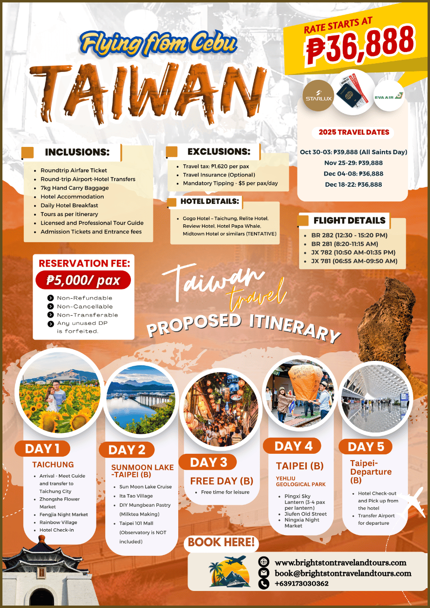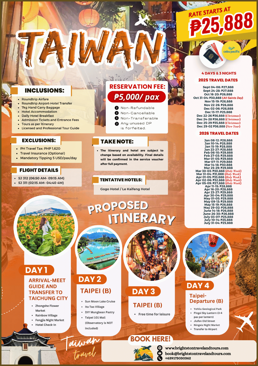 Ready to explore Taiwan’s wonders? From the lantern-lit streets of Jiufen, the bustling night markets of Taipei, to the breathtaking views of Sun Moon Lake and the iconic Taipei 101—Taiwan is where culture, nature, and modern charm come together for your unforgettable journey!